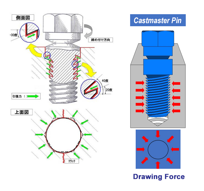 特許取得の外径上向きネジ山構造で周辺母材を引き寄せて、母材の強化を行います。